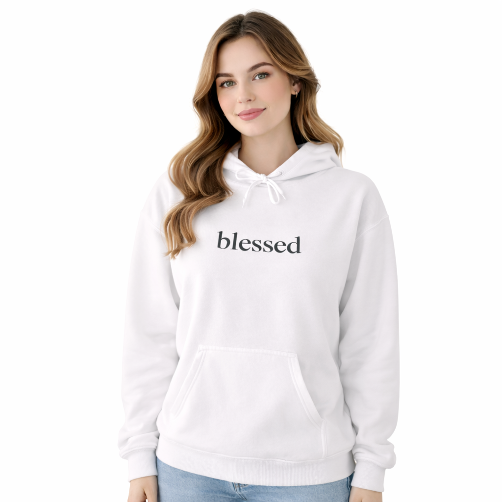 A clean lowercase blessed across the chest makes this hoodie a wearable reminder.